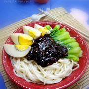 前上肉、鲜面条、卤鸡蛋、青菜、油、盐、葱、姜、蒜、甜面酱、老抽、花椒。