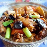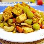 鸡腿、炸豆腐、火腿、香菇、蒜苗、姜、油、盐、甜面酱、酱油、料酒。