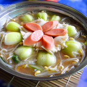 青菜、火腿、粉丝、黄豆芽、魔芋、油、高汤精、盐、葱。