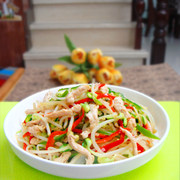 黄豆芽、鸡脯、青红椒、油、醋、蒜、酱油、盐、姜。