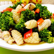 鲜鱿鱼、西兰花、红椒、蒜头、胡椒粉、蚝油、盐、糖。