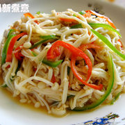 青红椒、金针菇、鸡脯肉、油、姜片、蒜、盐、鸡精、麻油。