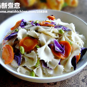 蝴蝶面、青豆、紫甘蓝、红萝卜、油、盐、胡椒粉。
