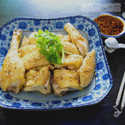 三黄鸡、生姜、冰水、麻油、生抽、盐焗鸡粉、芝麻酱。