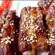 排骨、五香粉、盐、生抽、烧烤汁、姜、熟芝麻、蜂蜜。