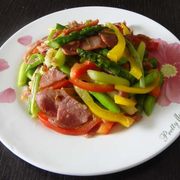 芦笋、彩椒、培根、葱、蒜、油、盐、鸡精、胡椒粉。