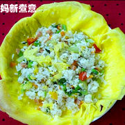 苦瓜、面粉、鸡蛋、火腿、葱花、油、盐、五香粉。