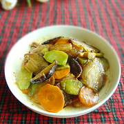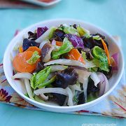 白菜、包菜、香菇、胡萝卜、木耳、洋葱、油、盐、鸡精。