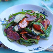 香肠、青椒、胡萝卜、胡萝卜、油、盐、鸡精。
