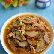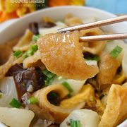 猪皮、白萝卜、木耳、炸豆腐、盐、糊椒粉、生抽 、蒜苗、鸡精。