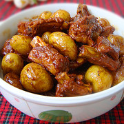排骨、小土豆、姜、老抽、糖、料酒、五香粉、盐。