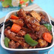 鸡腿、烤麸、胡萝卜、圆椒、木耳、豆腐干。