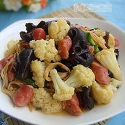 花菜、香肠、黄花菜、木耳、葱、蒜、油、盐。