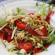 蓝纹奶酪、苦菊、风干火腿片、圣女果、生菜、橄榄油、冠利香醋、黄芥末、黑胡椒、盐。