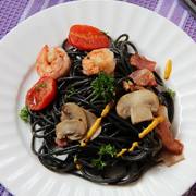 墨鱼汁面、烟肉、蘑菇、鲜虾、洋葱、圣女果、蒜、白葡萄酒、黑胡椒、橄榄油、清鸡汤、黄芥末、盐。