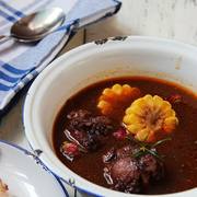 牛尾、甜玉米、西芹、番茄、洋葱、干玫瑰、迷迭香、甜罗勒、肥牛、口蘑、鲜虾、红酒、热水、盐、黑胡椒、番茄酱、橄榄油。