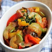 长茄子、黄彩椒、紫皮洋葱、番茄、红彩椒、西葫芦、大蒜、百里香、盐、橄榄油、黑胡椒。