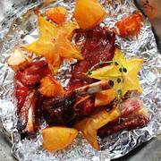 肋排、甜李子、橙子、苹果、杨桃、香葱、姜、百里香、叉烧酱、蜂蜜、生抽、老抽、白葡萄酒。
