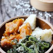 南瓜、土豆、茼蒿叶、自制蒸肉粉、盐。