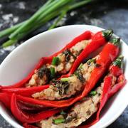 红辣椒、猪肉馅、橄榄菜、葱、姜、生抽、盐、料酒。