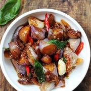 杭茄、小洋葱、去皮五花肉、蒜、鲜贝、朝天椒、罗勒、生抽、老抽、黄酒、白糖、水淀粉。