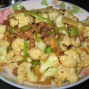 菜花、青辣椒、干红辣椒、葱花、蒜末、姜末、肉末、盐、酱油、鸡精、十三香、醋。