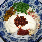 米线、豆花、韭菜、花生碎、腌菜、甜酱油、咸酱油、辣椒酱、油辣椒。