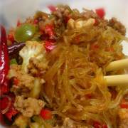 粉条、肉末、青椒、糖、豆瓣酱、料酒、酱油、鸡精、醋。