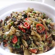 酸菜、肉末、青椒、红椒、生姜、蒜头、香菇、油、盐、生抽、蚝油、生粉。