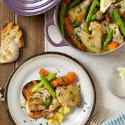 鸡、胡萝卜、小土豆、芦笋、小洋葱、意大利芹、面包、平粉、黄油、干白葡萄酒。