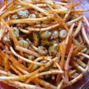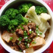 西兰花、花菜、萝卜烧牛肉、红薯粉、生抽、香油、盐、鸡精、辣椒油、葱、白糖。