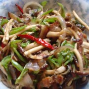 茶树菇、熟腊肉、洋葱、小米辣、青辣椒。