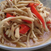 杏鲍菇、肉丝、红辣椒、盐、大蒜、油、生抽。