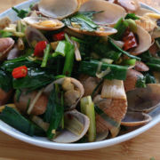 花甲、大蒜青苗、香菜、油、盐、红尖椒碎、大蒜末、老干妈、生抽。
