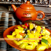 白豆腐、土豆、油、盐、酱油、老干妈豆豉、葱、蒜、姜、青椒、红椒、鲜骨汤、湿淀粉。