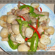 草菇、猪肉、青红椒、淀粉、酱油、盐、鸡精。