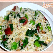 广式腊肠、肉末、鸡蛋、菜心、大米饭、盐、鸡精。