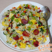 大米饭、鸡蛋、红萝卜、广东腊肠、小白菜、四季豆、盐、鸡精。