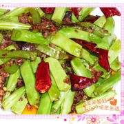 四季豆、肉末、青椒、干辣椒、豆瓣酱、酱油、盐、鸡精。