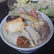 鸡、湿黄豆、姜、金针菇、豆腐、干腐竹、香菇、豆皮、大白菜、鱼豆腐、蟹棒、鱼丸、香肠、炸鱼片、扁食、牛肉卷、盐。