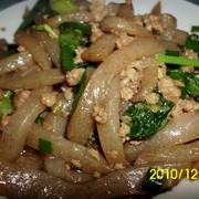 魔芋、肉末、蒜苗、葱花、姜、芹菜叶、盐、蚝油、鱼露、酱油。