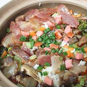 大米、腊肉、腊肠、脆皮肠、冬菇、芥蓝、红罗卜、盐、油。