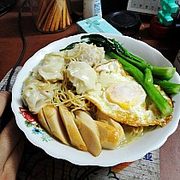 猪肉馄饨、虾子面、鱼肠、鸡蛋、青菜。