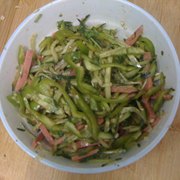 黄瓜、辣椒、金锣火腿肠半根、蒜、香菜、盐、味精、十三香、糖、陈醋、东古酱油。