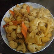 菜花、瘦肉、胡萝卜、葱、姜、干红辣椒。