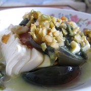 皮蛋、嫩豆腐、榨菜末、麻油、盐。