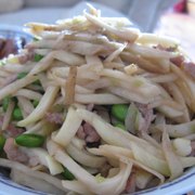 茭白、毛豆、肉丝、盐、生抽、糖、鸡精、生粉。