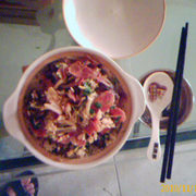 稻米、腊肠、鲜冬菇、芹菜叶、洋葱二层。