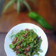 青角椒、瘦肉、生姜、蒜、生抽、老抽、料酒、白糖、醋、盐、味精、食用油、地瓜粉。