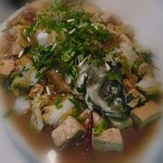 鲤鱼、白菜、宽粉、大豆腐、小香葱、大葱、香菜、姜、干辣椒、八角、花椒、料酒、盐、味素、冰糖、老抽。
